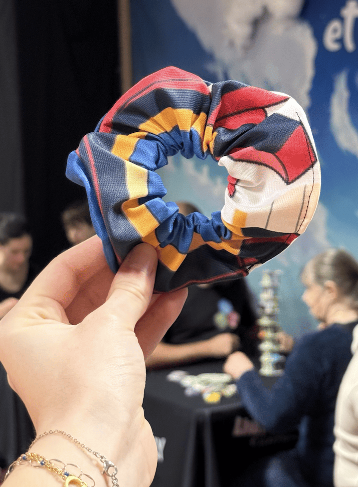 Chez Unfriendly Games on a cherché une seconde vie pour les bâches utilisées sur les évènements. C’est ainsi qu’ils ont imaginé chouchous à cheveux et pochettes. Et comme Karen et David ne sont jamais avares de jolies idées, ils ont demandé à l’une de leur voisine couturière de designer tout cela. Résultat ? De jolis goodies que tout le monde s’arrachait sur leur stand du FIJ.