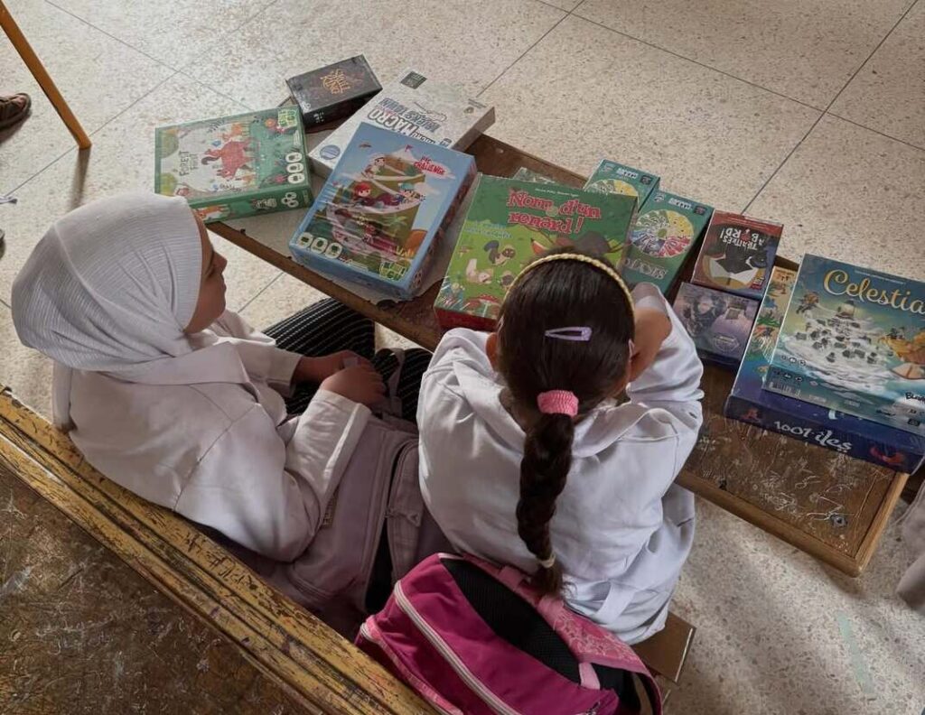 Avec les punchlines d’Olivier, la glace se brise rapidement et les minutes défilent à toute vitesse. Les parties de Flip 7 s’enchainent, Courtisans révèlent les compétences stratégiques de chacune et tout ça, sous l’oeil tendre de Cécile Durand. Cécile est auxiliaire de puériculture chargée de l’animation de l’espace enfants de pédiatrie au CHU, c’est grâce à elle et à Romain Lebeau, éducateur de jeunes enfants au (Service d’Hématologie et d’Oncologie Pédiatrique) que le partenariat a pris vie, il y a déjà trois années déjà. Une histoire née d’un simple don de jeux au service d’oncologie pédiatrique du CHU Clermont-Ferrand à l’occasion de Septembre en or (mois de sensibilisation contre les cancers pédiatriques) en 2022. S’en est suivi une profonde amitié pour les intervenants de ces services et une convention signée dans la foulée.