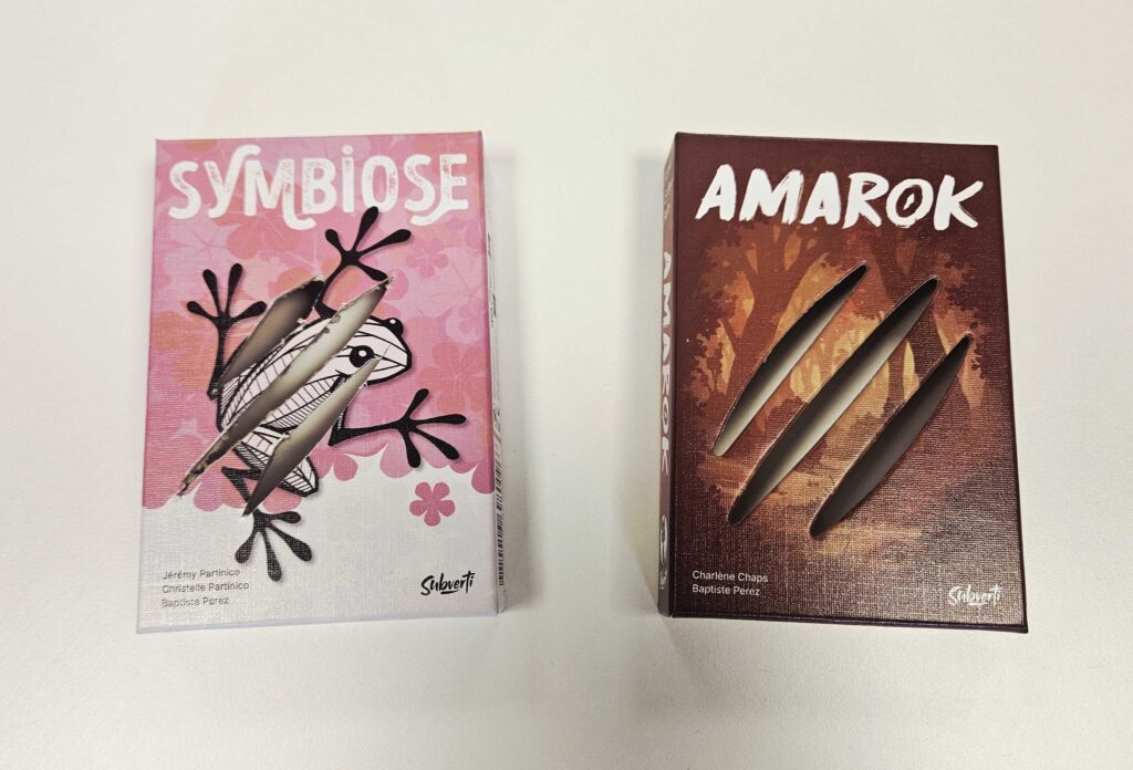 At Subverti, nothing gets thrown away—everything gets reused. The game boxes are turned into craft kits batch of games (they’re cut up, punched with holes, etc.). Take the game *Symbiose*, for example, which is getting a new look… and you’ll easily recognize what has become the future *Amarok* collector’s edition.