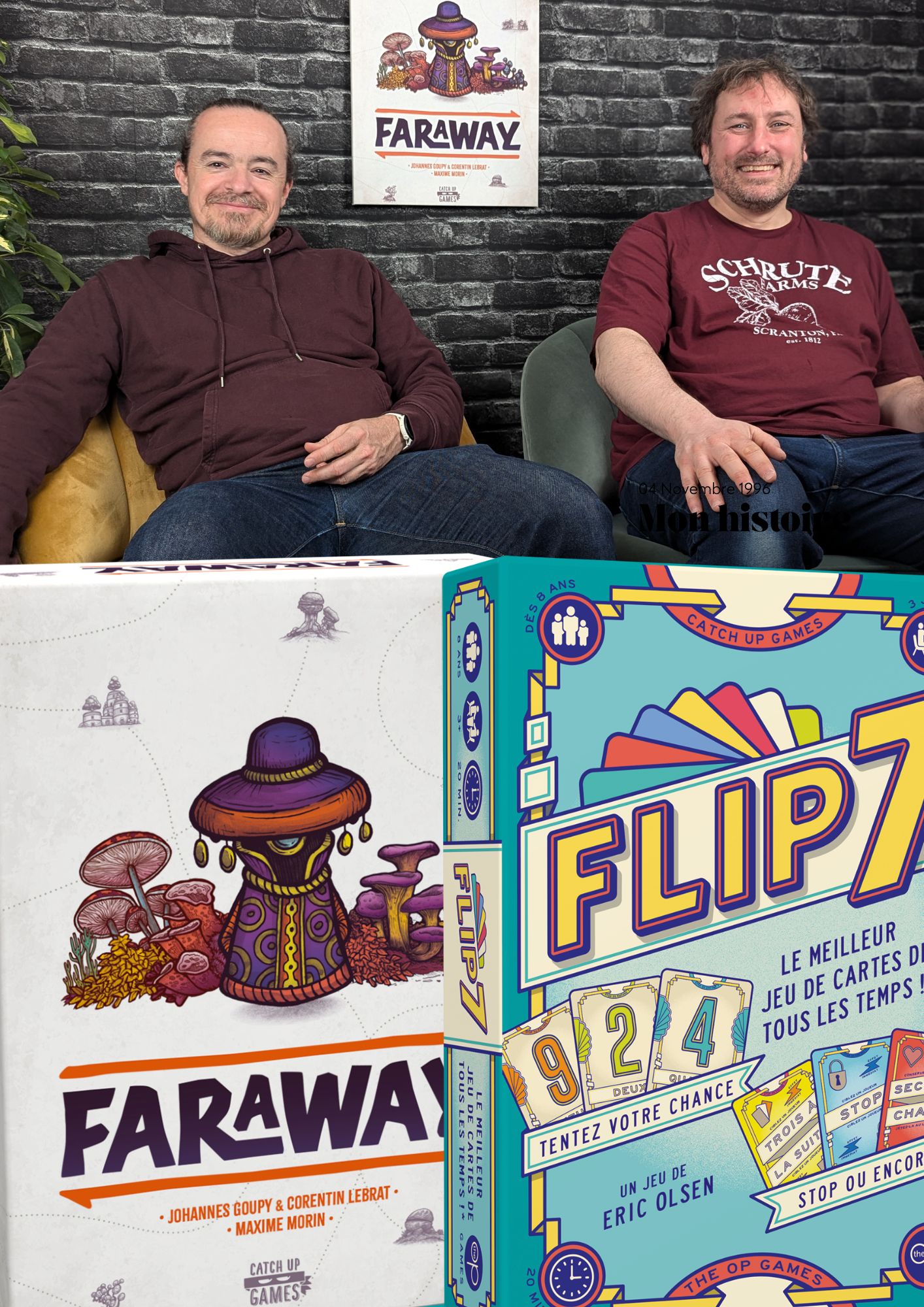 Boom ! Deux jeux engagés dans la dernière ligne droite ! Catch Up Games n’a pas fait dans la demi-mesure mardi dernier. Avec Faraway nommé dans la catégorie Kennerspiel des Jahres (jeu connaisseurs) et Flip 7 dans la catégorie Spiel des Jahres (jeu de l’année), l’éditeur lyonnais n’a jamais été aussi près de toucher le Saint-Graal du monde ludique remis par un panel de professionnels et d’experts du milieu. Mais avant de connaitre les résultats qui seront dévoilés le 13 juillet à Berlin, on a voulu savoir comment Sébastien et Clément vivaient cela.