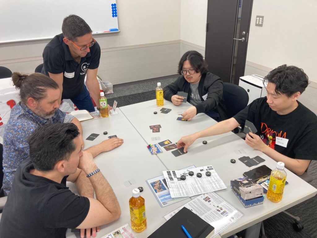 Un obstacle pour leur faire découvrir les jeux du catalogue mais aussi à l’inverse pour tester les jeux nippons : « La problématique dans les échanges, renchérit Yoann se pose aussi lorsque c’est nous qui sommes en phase test. En règle générale, on utilise des logiciels de traduction pour passer du japonais au français, ou alors ce sont eux qui traduisent directement les règles en anglais mais là encore sans véritablement maîtriser la langue. Résultat, les règles étant largement fausses, les 3/4 du temps on passe à côté de certaines subtilités et de ce fait du jeu. En étant sur place, on a pu rencontrer directement les auteurs. Au moindre doute en cours de partie on pouvait les interroger via Yannick. C’était un plus certain ».